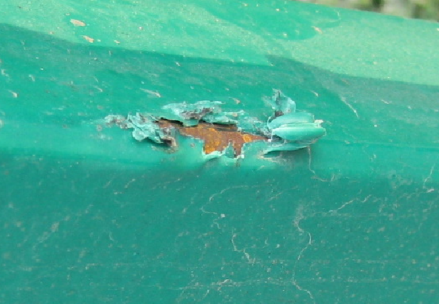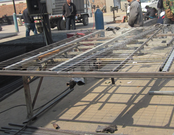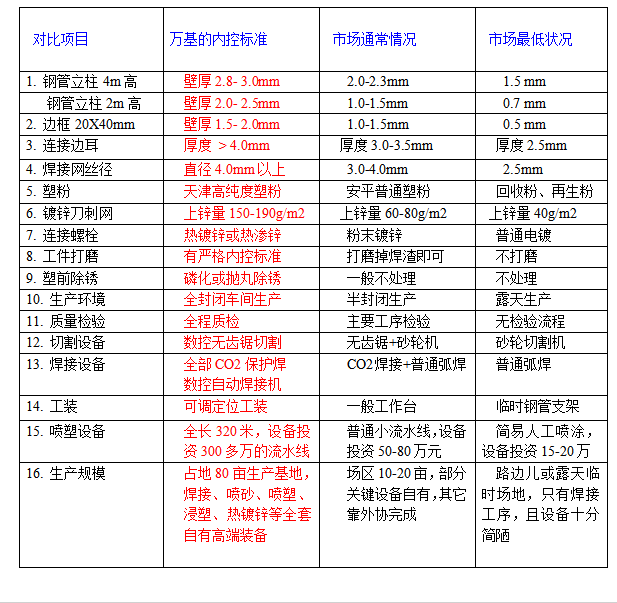 大多数厂家露天生产,钢件在焊接过程已经生锈,并且不做基材防锈处理,带锈浸塑,水汽会沿着塑层与基材间的缝隙渗漏,新装的围网3/5个月就开始生锈,有的2-3年锈烂。