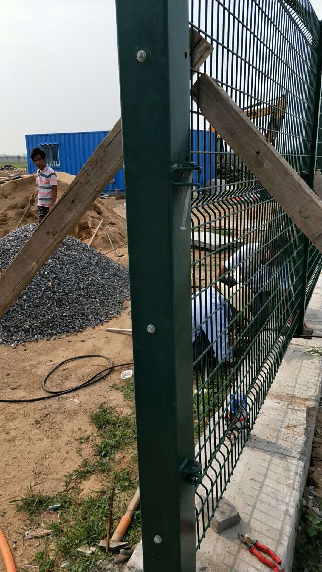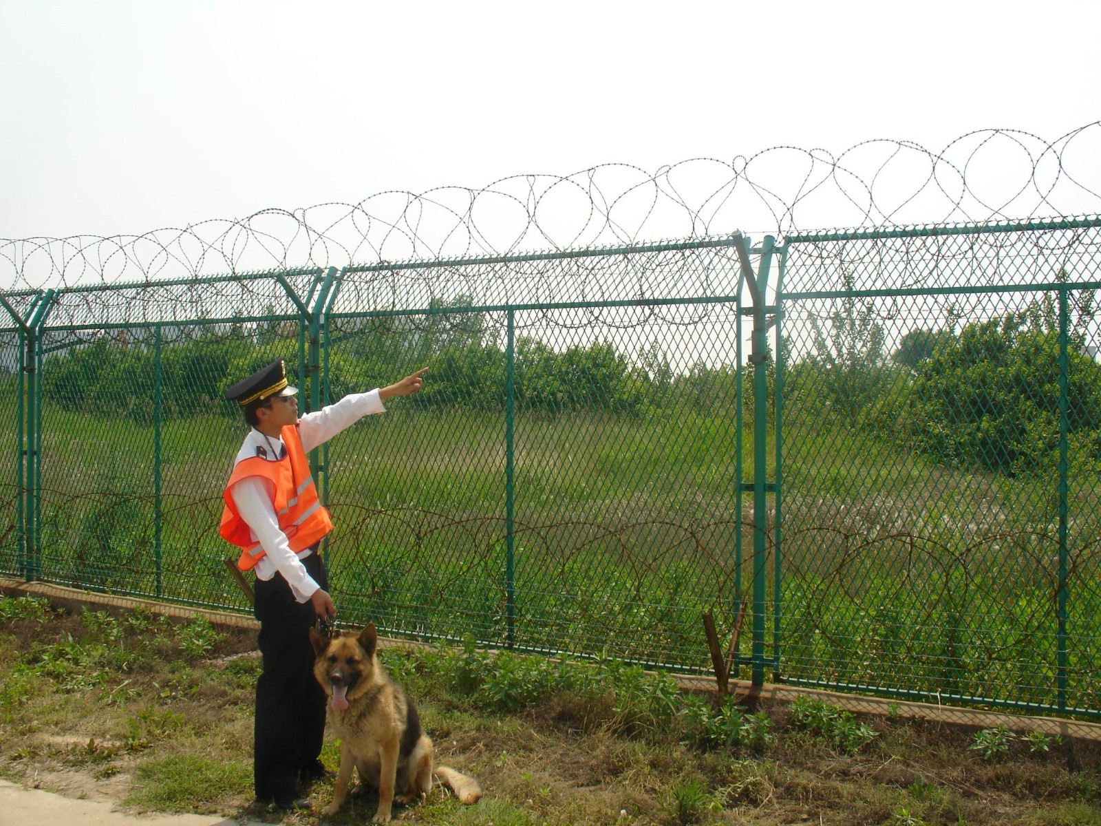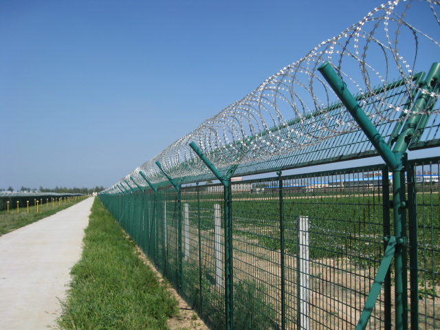 机场隔离栅是由加强型焊接片网,安全防盗连接件和热镀锌刀片刺笼组成加强度和安全防御性级别很高。材 质:采用5.0mm高强度低碳钢丝焊接。刀 片:镀锌钢板。 工 艺:热镀锌-冲压。 卷径规格:625px、750px、1000px、1125px、1375px、1500px等等网孔:50*100mm/50*200mm网片中带有V型加强筋,可大大增加围网的抗冲压力。立柱:60*60mm的矩形钢,顶端焊有V型支架。或70mm*100mm的柱式连接立柱。表面处理:电镀,热镀锌,喷塑 浸塑。 优点:1.具体美观,实用,方便运输和安装的特点。 2.要以在在安装时地形适应地形,与立柱链接位随地面起伏可上下调整; 3. 在机场护栏网的横向加装四道折弯加强筋,在整体成本增加不多的同时,使网面强度和美观显著增强加,是目前国内外最受欢迎之一