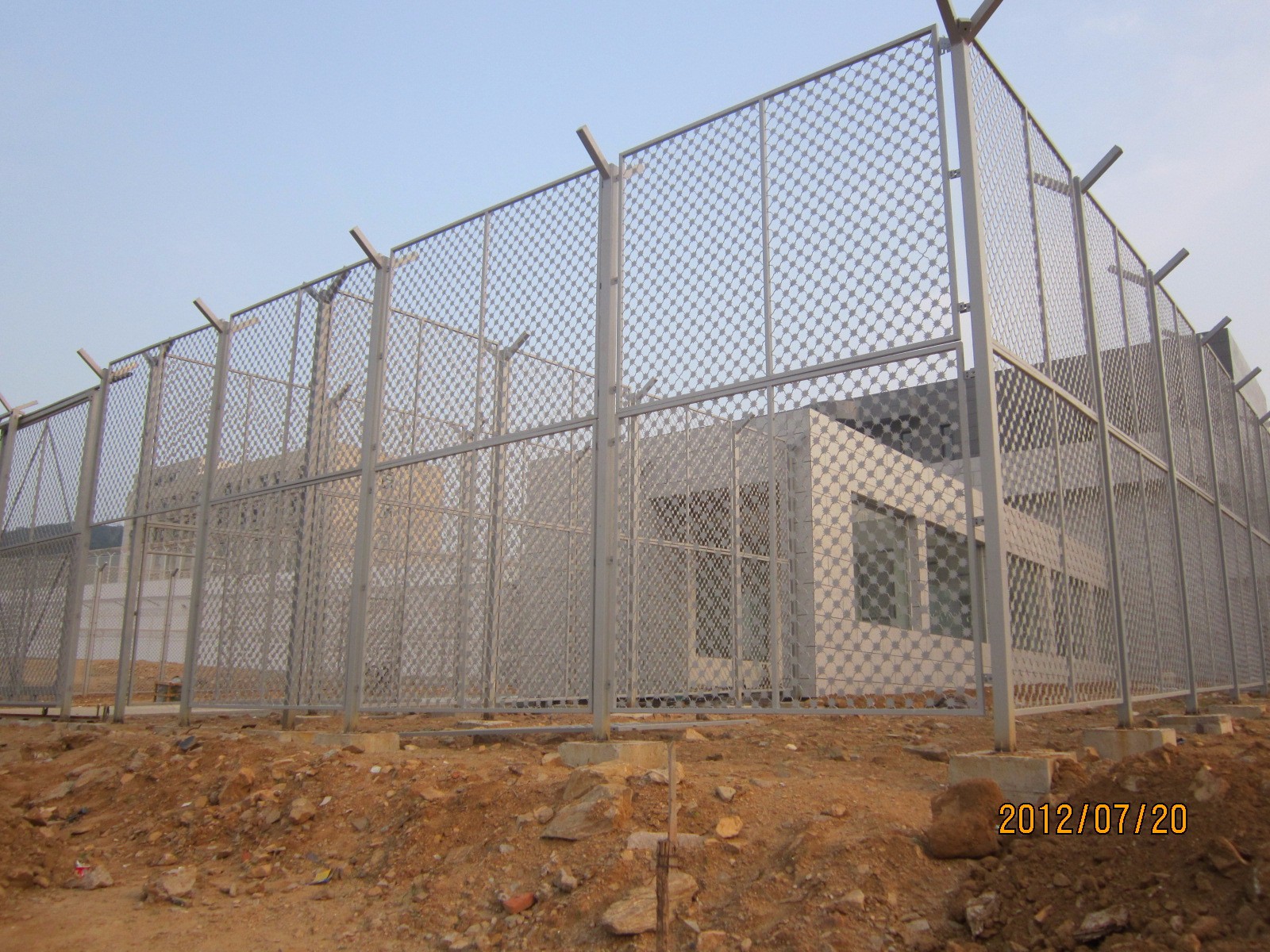 (4)刀片刺绳护栏网的柱子是60X60矩形钢,顶部焊接有V形框架,或使用70mmX100mm悬挂式接线柱。