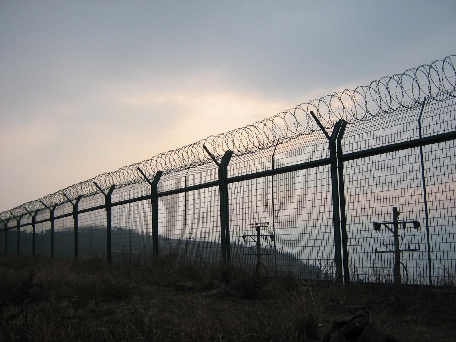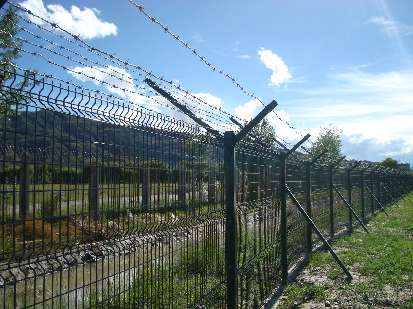 机场隔离栅是由加强型焊接片网,安全防盗连接件和热镀锌刀片刺笼组成加强度和安全防御性级别很高。材 质:采用5.0mm高强度低碳钢丝焊接。刀 片:镀锌钢板。 工 艺:热镀锌-冲压。 卷径规格:625px、750px、1000px、1125px、1375px、1500px等等网孔:50*100mm/50*200mm网片中带有V型加强筋,可大大增加围网的抗冲压力。立柱:60*60mm的矩形钢,顶端焊有V型支架。或70mm*100mm的柱式连接立柱。表面处理:电镀,热镀锌,喷塑 浸塑。 优点:1.具体美观,实用,方便运输和安装的特点。 2.要以在在安装时地形适应地形,与立柱链接位随地面起伏可上下调整; 3. 在机场护栏网的横向加装四道折弯加强筋,在整体成本增加不多的同时,使网面强度和美观显著增强加,是目前国内外最受欢迎之一
