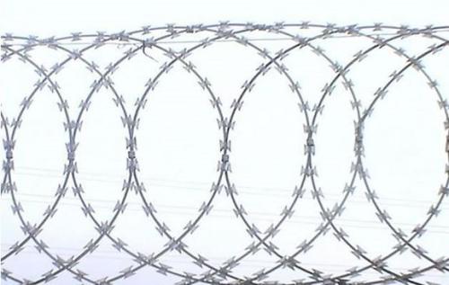 1、剌丝滚笼采用刀片刺绳绕圈后相临两圈每隔120度用刺丝连接卡固定,张开后形成蛇腹网状闭合后刀剌绳圈径为50cm,张开后每交叉圈安装间距20cm,直径不小于45cm。